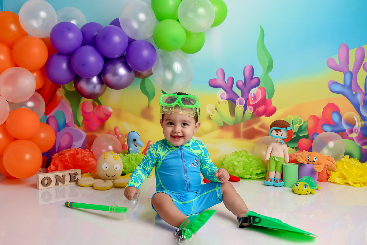 Smash the cake - menino mergulhador - fundo do mar - mar - foto de criança - ensaio 1 ano - cenário fundo do mar